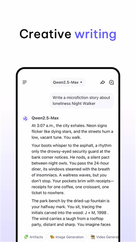 3、Qwen 将链式思维推理与创意构思相结合,系统地创作叙事、塑造角色和探索情节。它充当写作助手,提出场景并将想法整合为连贯的框架。凭借多模态能力,它融合视觉与文本推理,适用于编剧、游戏设计和沉浸式叙事,帮助用户在创造力与逻辑一致性之间取得平衡。