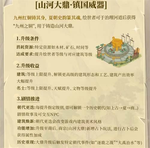 华夏绘世录山河大鼎怎么升级?华夏绘世录是一款全新的国风历史模拟经营风格的游戏,在这里享受古风城镇模拟建设玩法,卷绘千载,运筹帷幄。游戏中山河大鼎·镇国威器,九州红铜铸其身,夏朝史韵篆其魂,绘世者可于治理河道后获得"九州之铜“,用于铸造山河大鼎。下面给大家带来了华夏绘世录山河大鼎升级介绍!