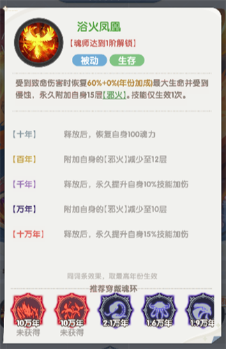 受到致命伤害时恢复60%+(年份加成)最大生命并受到侵蚀,永久附加自身15层【邪火】。技能仅生效1次。