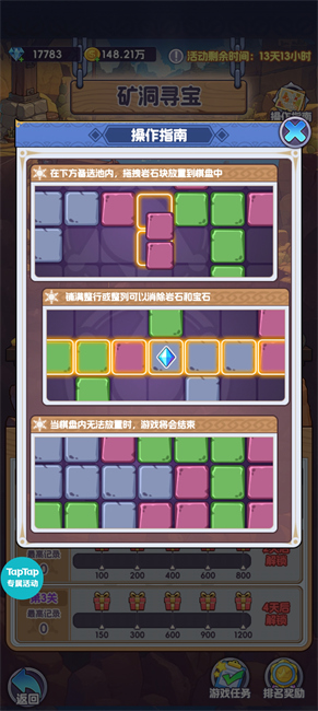 小游戏玩法类似于俄罗斯方块,是开始游戏后每轮会提供给你三个随机格式的岩石块,填满一整列进行消除便可得分,如果连续消除还有得分加成。上次考验手,这次主要考验运气,如果运气不好很容易出现无法消除的岩石块导致游戏失败。作者推荐以消除为主,不要太贪连续消除加成。每日奖励很不错记得拿满,分实在不够可以拿钻石补