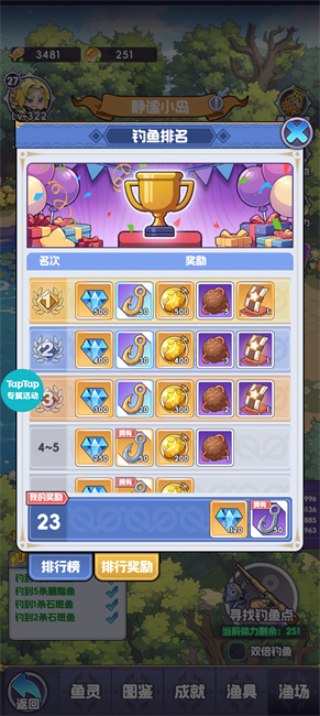 主要其实就是对钓鱼玩法进行了每日奖励加成,以及新增了限时排行榜。没有攒钓鱼体力也无所谓,之前提升钓鱼等级,到达高等级鱼塘钓鱼获得的鱼币也会更多,而记分原理是看你钓上来鱼的鱼币价值来进行算分。建议任务做完后前往目前解锁的最高等级鱼塘将每天体力钓完即可。如果没有鱼点可以在每天的12,18,21的官方鱼点钓鱼