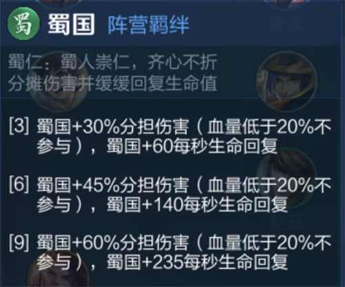 羁绊和阵营比较类似,但是和阵营却全然不同。目前游戏当中一共有四种羁绊,分别是魏蜀吴和长安。游戏当中的羁绊共有三个等级,羁绊等级越高,获得的加成也就越强,提升羁绊等级的唯一方式,就是让相同阵营的英雄上阵。蜀国的阵营羁绊将会给全体蜀国角色,带来高额的生命回复效果和伤害分摊能力。当蜀国9位角色全部上阵,那么蜀国的角色每秒就会恢复235点体力值,并且将自身受到伤害的60%十分摊给其他全部的蜀国队友。