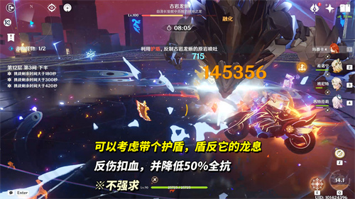 12-3下半,古岩龙蜥(413万血)。也是许久未见这个BOSS了,此次深渊为冰元素古岩龙蜥,拥有30%冰抗50%岩抗,在目前多样化的减抗手段面前,这点抗性基本对配队无影响。对局中它的龙息命中护盾触发盾反,扣除BOSS血量+降低50%抗性,有盾也可带上能省不少时间~