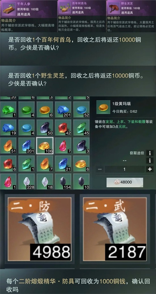 卖不用的宝石、一二阶装备熔断分解、宗派系统(何首乌、千年人参、野生灵芝)