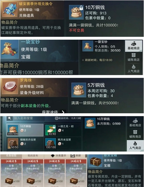 铜币是最容易获取也是最常用的一个货币,基本所以提升属性的玩法都要用到。铜币主要产出途径就是日常和完成悬赏,铜币还可以通过银两兑换获得。