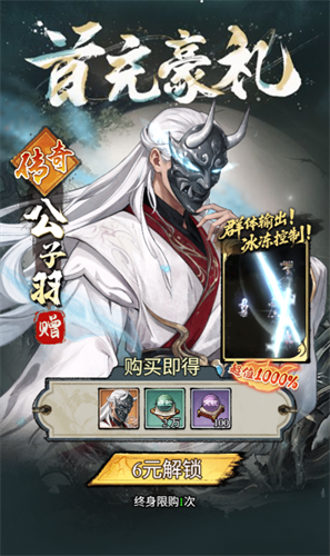 6元首充得群攻豪侠公子羽,绝技造成200%全体伤害,附加20%易伤,集火带冰冻控制。