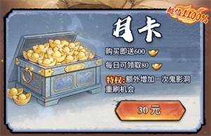 购买即送600元宝,每日额外再领80元宝,额外增加鬼影洞重置次数,高阶装备机会+1。