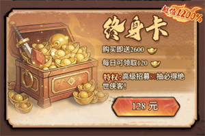 性价比之王,一次购买终身回报!随等级&推塔提升可领9600元宝+165抽高级侠客令,侠客培养无忧,全程领先一步。