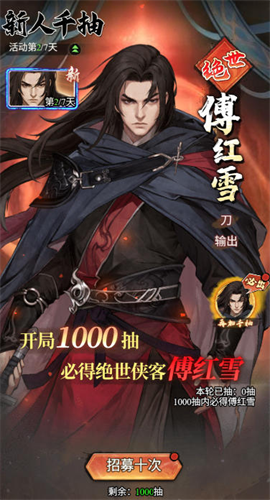 角色28级开启,每日100抽中自选10抽,累计千抽必得指定“红品”绝世侠客【傅红雪】。