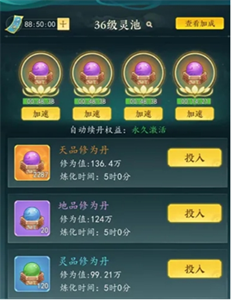 ①灵池共有四个格子,可投放修为丹进行炼化,根据境界不同炼化时间会有所不同,可通过加速符进行加速催化炼化时间。炼化完成后修为丹将转化为修为值;