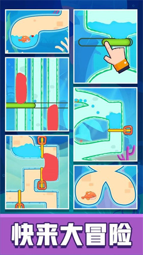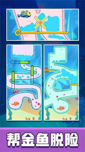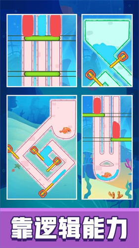 2、游戏融合物理谜题与策略闯关,玩家需利用推箱子、水流引导、杠杆原理等机制,避开捕食者、破解障碍,为小鱼开辟逃生路线。