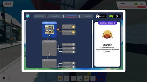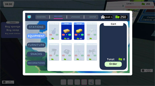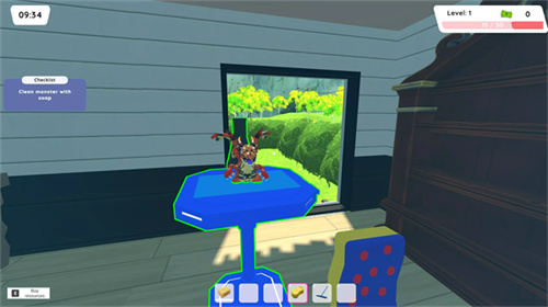 2、初期购买清洁台、肥皂等工具,接待脏污的怪兽客户,清洗后安置于庭院等待主人领回并获取报酬。