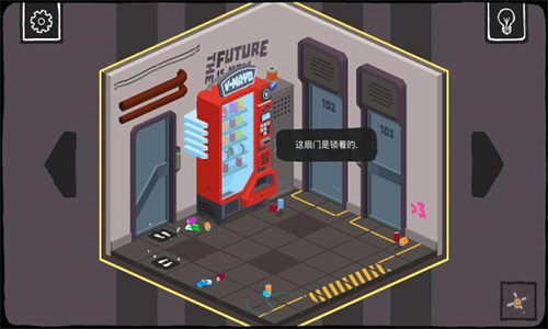 5、旋转视角看到卷帘门,将红色按钮安装在卷帘门的控制器上即可打开,之后便可离开第一场景前往庭院。