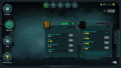 2、途中可收集散落的金币用于升级系统,强化背包的稳定性、燃料续航与推进效率,提升整体生存能力。
