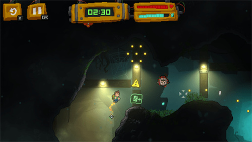 1、在狭窄的洞穴通道中操控喷气背包飞行,既要躲避尖刺、滚石等静态陷阱,也要应对突然出现的敌人攻击。