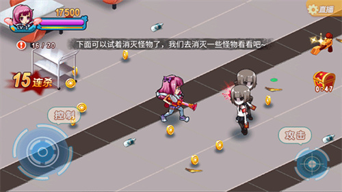 1、滑动屏幕可以控制萌妹纸移动,击杀沿途的敌人,拾取敌人死后爆出来的道具和金币