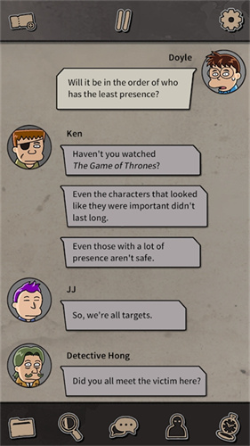 3、游戏非常考验玩家的逻辑思维能力和细心程度,要准确的抓到每一个重点才能够更好的找到凶手,来看看你能够用多长时间找到凶手吧。丰富的剧情,游戏中您扮演的角色将被困在雪山中,而且还出现了死亡事件,作为玩家的您需要通过线索来推理出杀人凶手,每一个细节之处都不要放过哦。