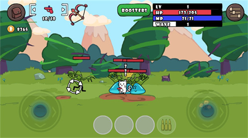 2、简单的横版战斗手游,操作猫咪射击怪物,击退怪物,就能获得胜利。